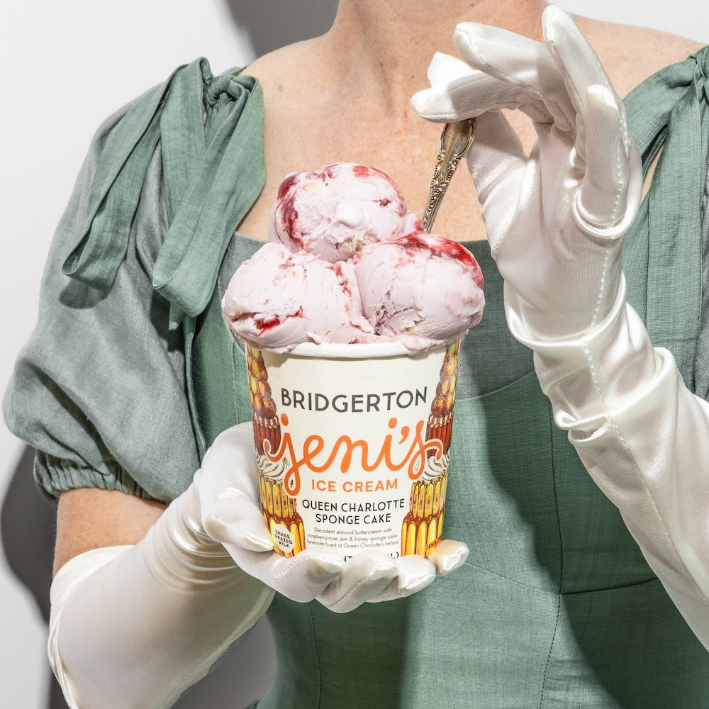 An ice cream made for the world of Bridgerton. Fantastical, decadent, and inspired by what we imagine would be Queen Charlotte’s signature dessert: a towering confection at the center of her table. Spoon-coating buttercream ice cream scented with almond for a delicate, marzipan-like flavor, deepened with notes of brown sugar. Soft golden honey cake. And raspberry-rose jam for pops of tartness and a subtle floral finish. All decked out in Her Majesty’s favorite shade of lavender. Flawless, my dear.